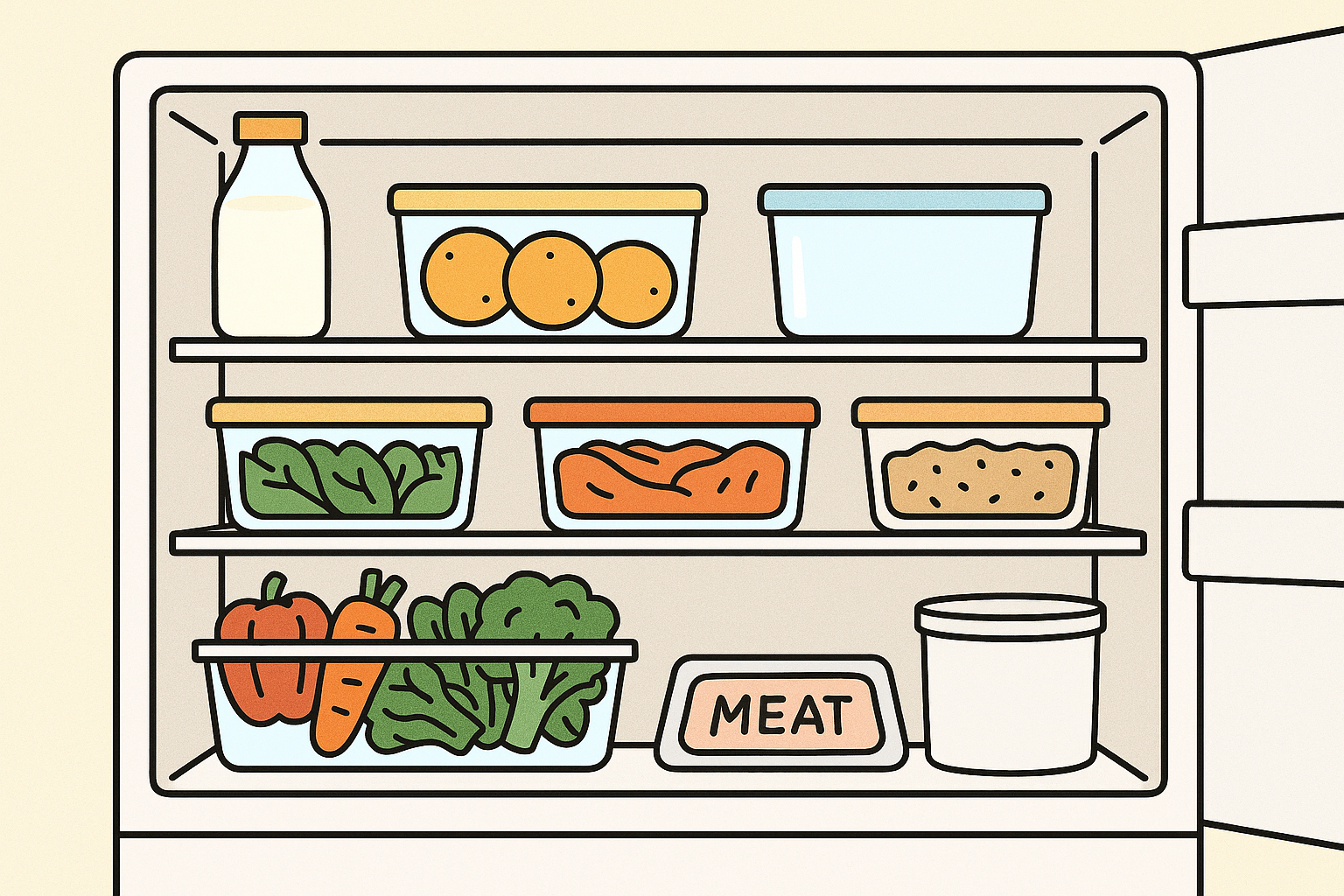 냉장고 정리의 핵심은 공기 흐름 확보 + 한눈에 보이는 배치입니다.